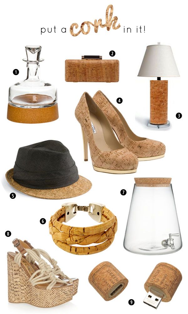 I’ve always liked the natural texture of cork. Fabulously neutral, it pairs perfectly with this season’s bright colors and looks equally chic with your basic blacks and whites. Designers are finding all sorts of unique ways to use this renewable resource, adding it to hats, home decor, and gadgets. Two of my favorites are the chic fedora from San Diego Hat Company and the gorgeous Robyn Brooks lamp.