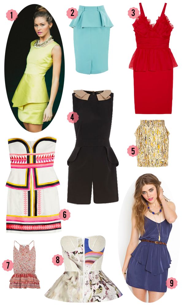 The word peplum often conjures up the image of a 50’s-inspired dress or skirt, but designers have updated and interpreted it for almost any style (ex: boho, streamlined, fashion-forward). Peplums are even turning up on rompers and swimwear!