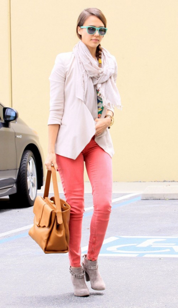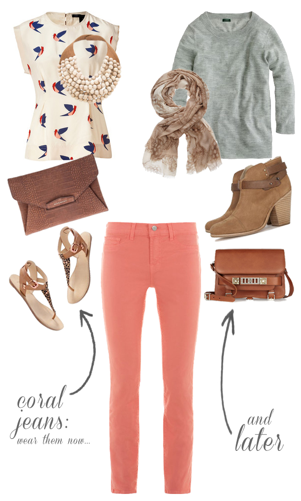 Never fear! You still have plenty of time to wear those pretty pastel jeans… with the right styling, you can carry this summer’s trend right through fall! I am particularly fond of these J Brand coral 811 skinny jeans, but other shades (mint, lavender and yellow) would look just as great!