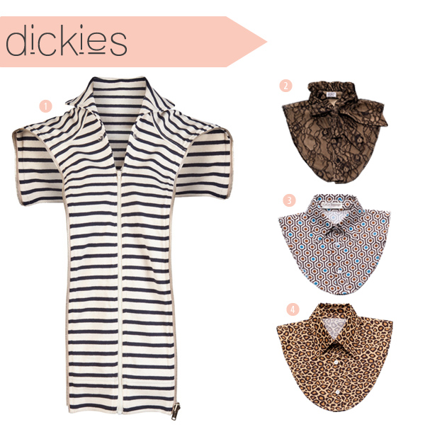 It’s no secret that style-watchers are focusing in on collars. It’s a trend that’s relatively easy to pull off. There are tons of options out there: the removable collar, the collar necklace, and (please, don’t laugh) the dickey. For those of you who do not know, the dickey is basically a collar that is attached to a “bib” and gives the illusion you are wearing a shirt. Dickies can change the look of a sweater or shell without any bulk or pesky bunching and twisting. They are especially handy to a Texan (like me) who appreciates the layered look, but rarely sees the opportunity, what with the heat soaring well through fall!