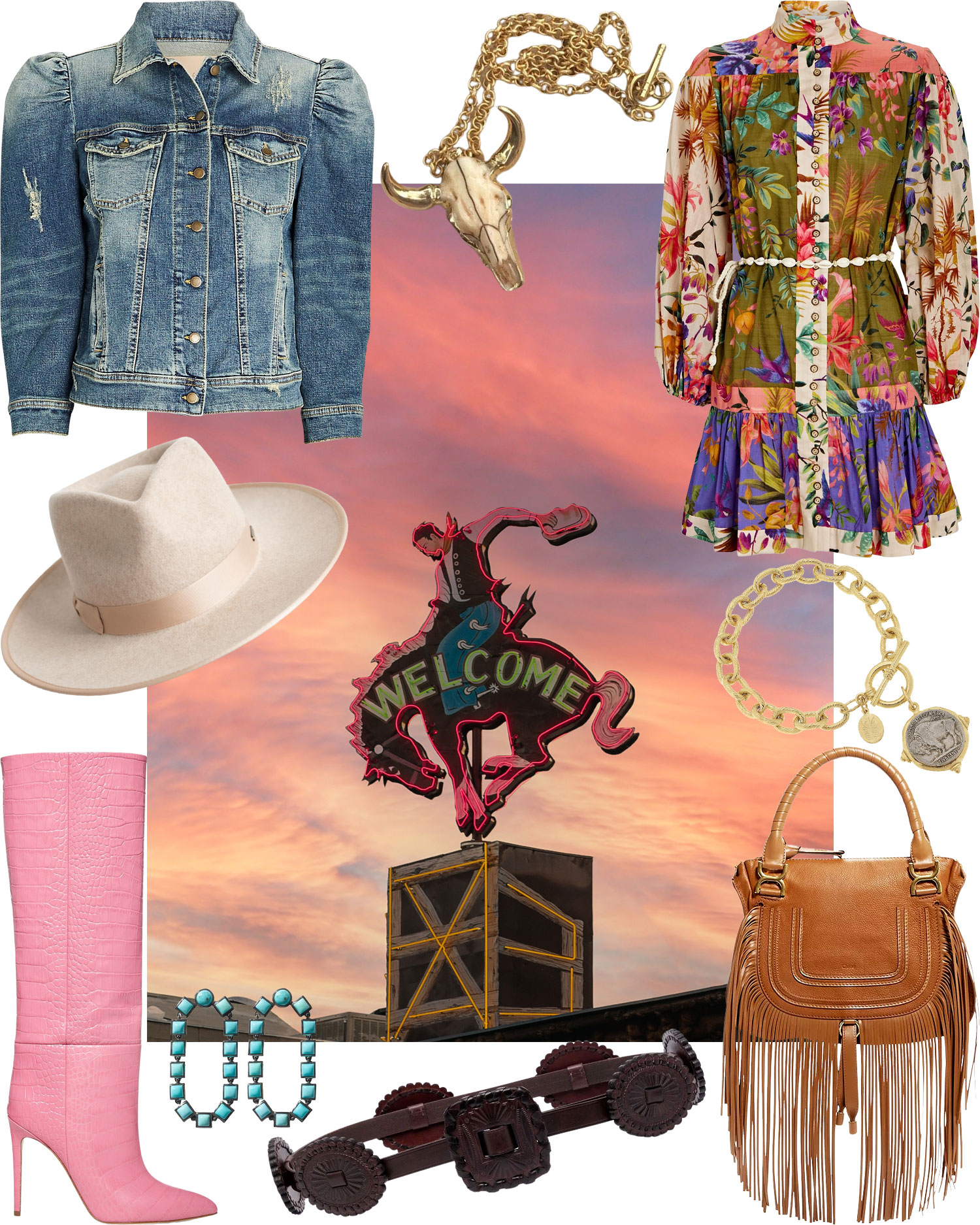 Clockwise from top left: RETROFETE Ada Puff Sleeve Denim Jacket // ETSY Bull Head Necklace // ZIMMERMAN Tropicana Floral Belted Dress // SUSAN SHAW Buffalo Nickel Bracelet // CHLOE Marcie Medium Fringe Bag // RALPH LAUREN Leather Concho Belt // NAK ARMSTRONG Nakard Loop Sterling + Turquoise Earrings // PARIS TEXAS Embossed Knee-High Boots // GIGI PIP Monroe Rancher Hat